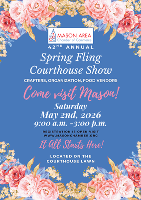 Join us for one of Mason’s most beloved traditions — our outdoor Spring Fling Courthouse Show, now in its 42nd year! This popular event features 130 vendor lawn spaces and welcomes crafters, artists, food vendors, and more.