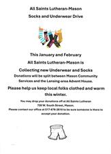 517-676-2610 New Sock and Underwear Drive to benefit Mason Community Services and Lansing Area Advent House.