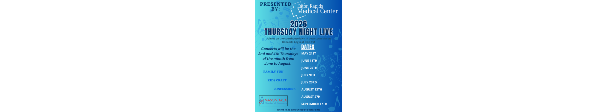 Dates & Time: Every other Thursday, May – Mid-September | 6:30 PM – 8:00 PM This is a FREE event. Performance: Sea Cruisers Thursday Night Live! – Free Summer Concert Series Join us for the 20th season of Thursday Night Live!, while Making Mason Memories. Hosted by the Mason Area Chamber of Commerce and sponsored by local Chamber businesses, this free concert series brings the community together for evenings filled with live music, fun, and friendships. Enjoy performances from a variety of talented musicians while relaxing on the courthouse lawn. Free children's activities are provided by local Chamber businesses, making this a perfect evening for the whole family. Bring your lawn chairs and blankets, grab some delicious concessions available for purchase from the Mason Optimists Club and Marco's Pizza, and soak in the sounds of summer in our beautiful and historic downtown. Presenting Sponsor: Eaton Rapids Medical Center For the full concert lineup and updates, visit www.masonchamber.org and follow us on Facebook: Mason Area Chamber of Commerce.